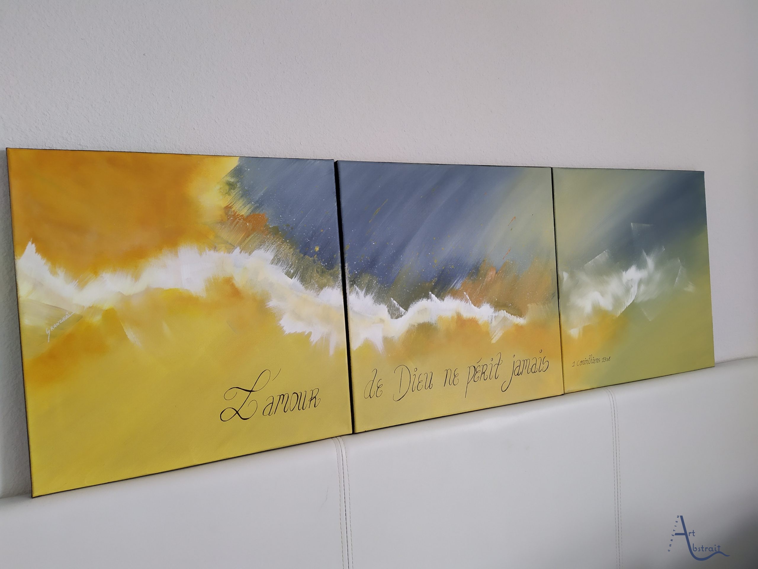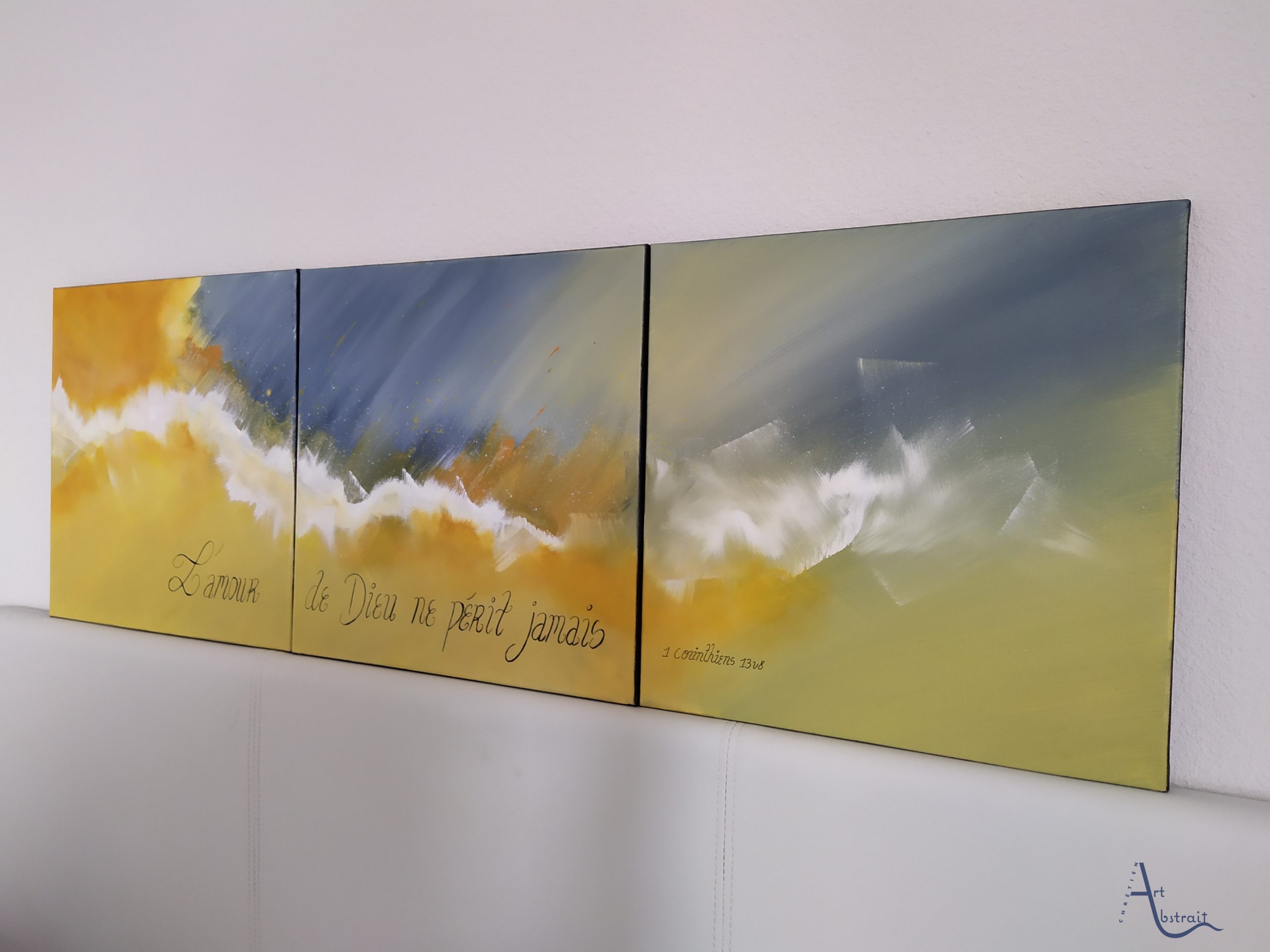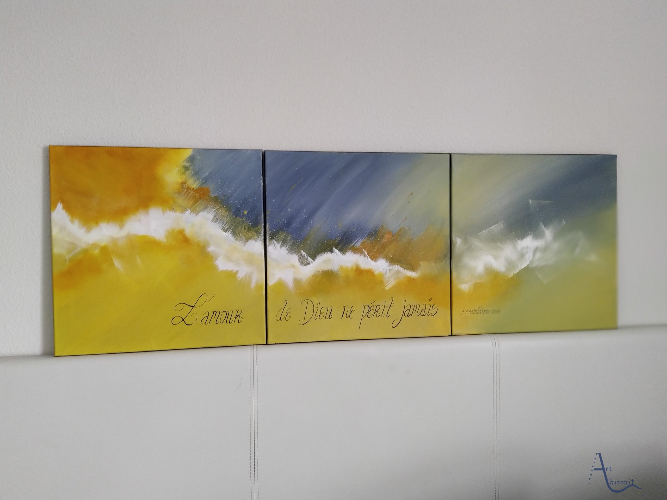 Oeuvre unique Toile en coton Peinture utilisée : Acrylique Vernis brillant Signature devant et au dos Dimension: 3 toiles de 40*40 (120cm*40)