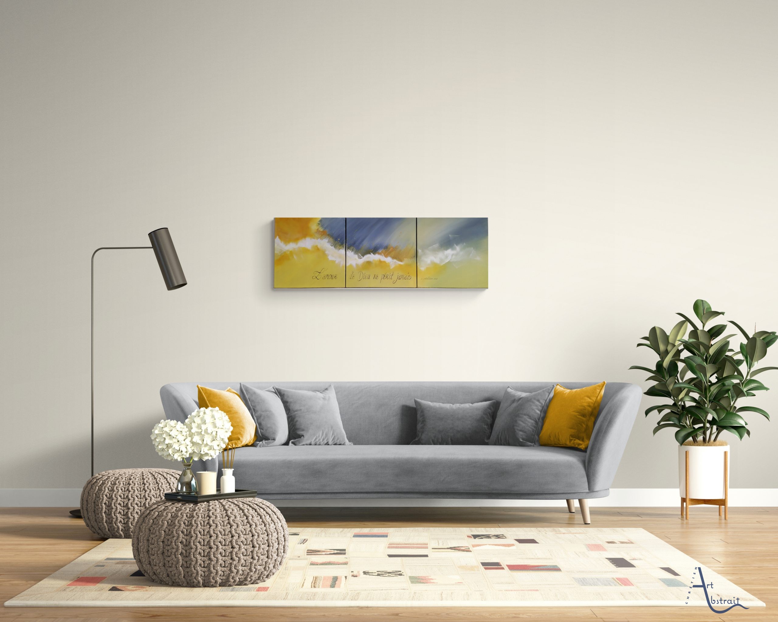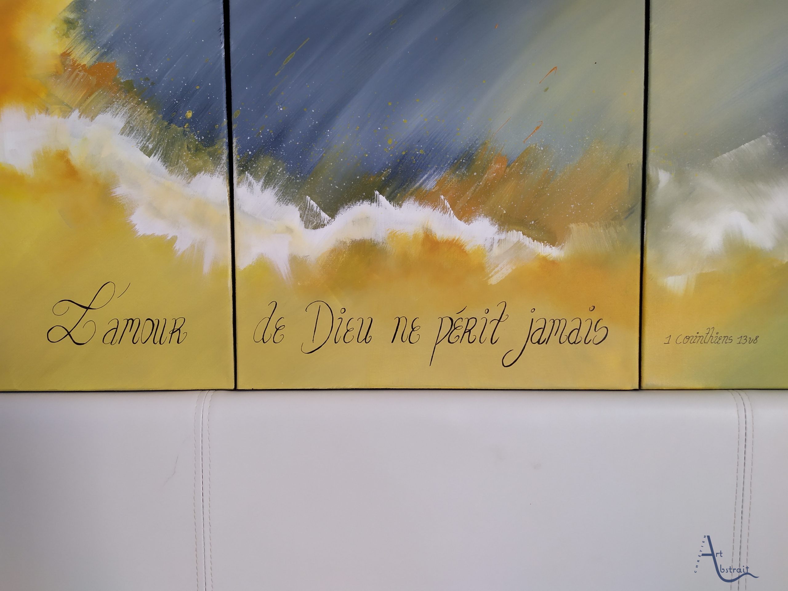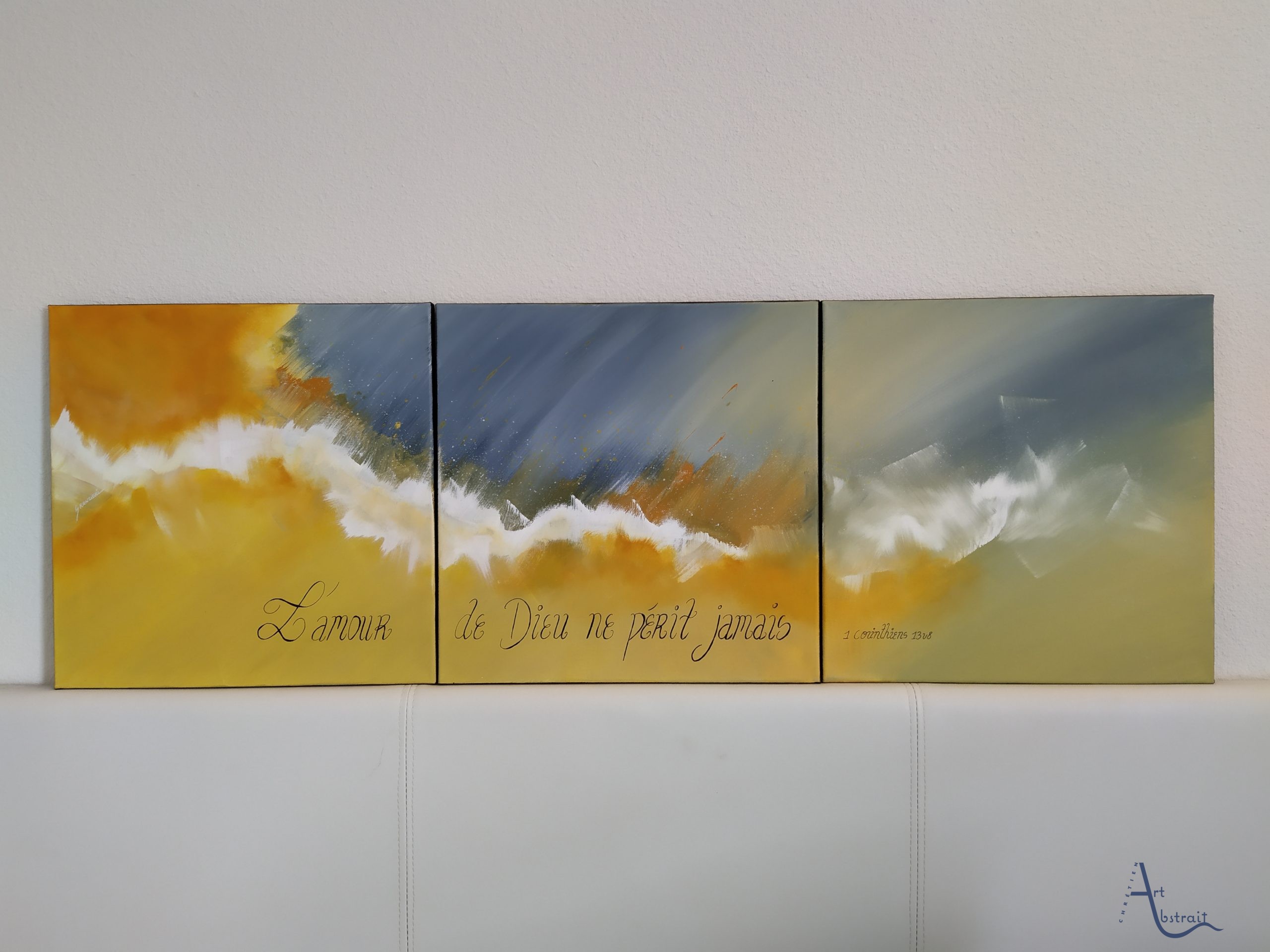 Oeuvre unique Toile en coton Peinture utilisée : Acrylique Vernis brillant Signature devant et au dos Dimension: 3 toiles de 40*40 (120cm*40)