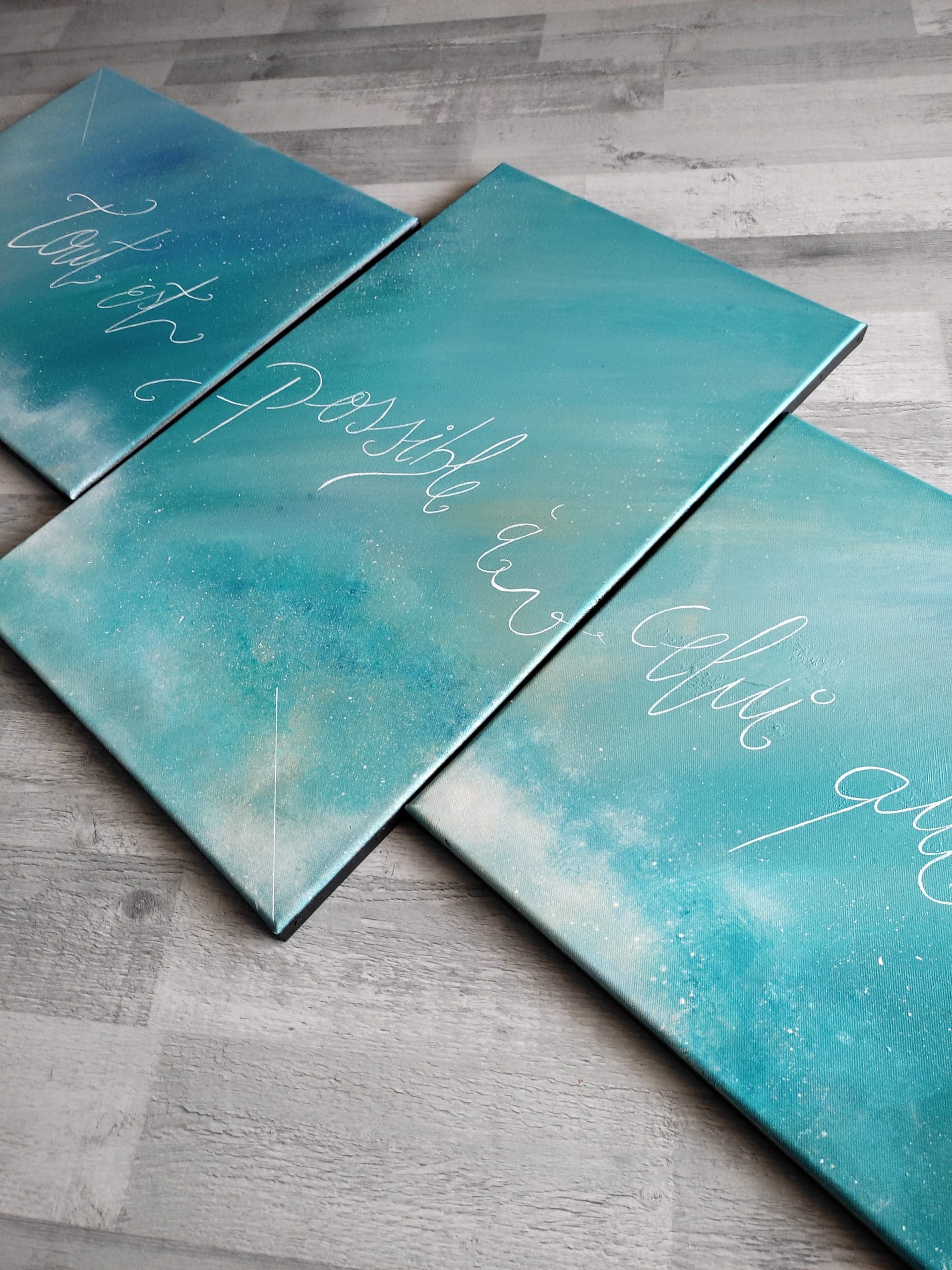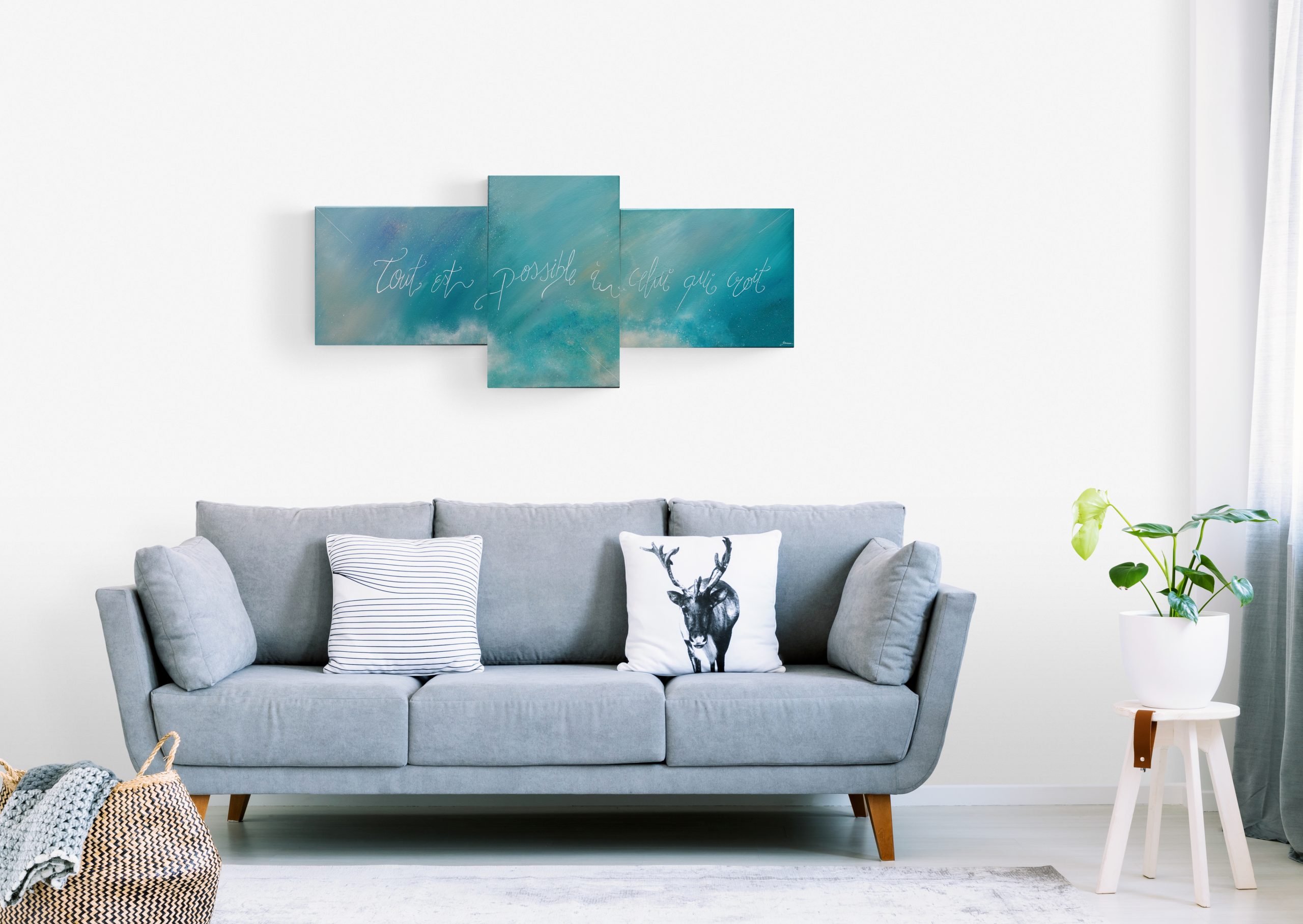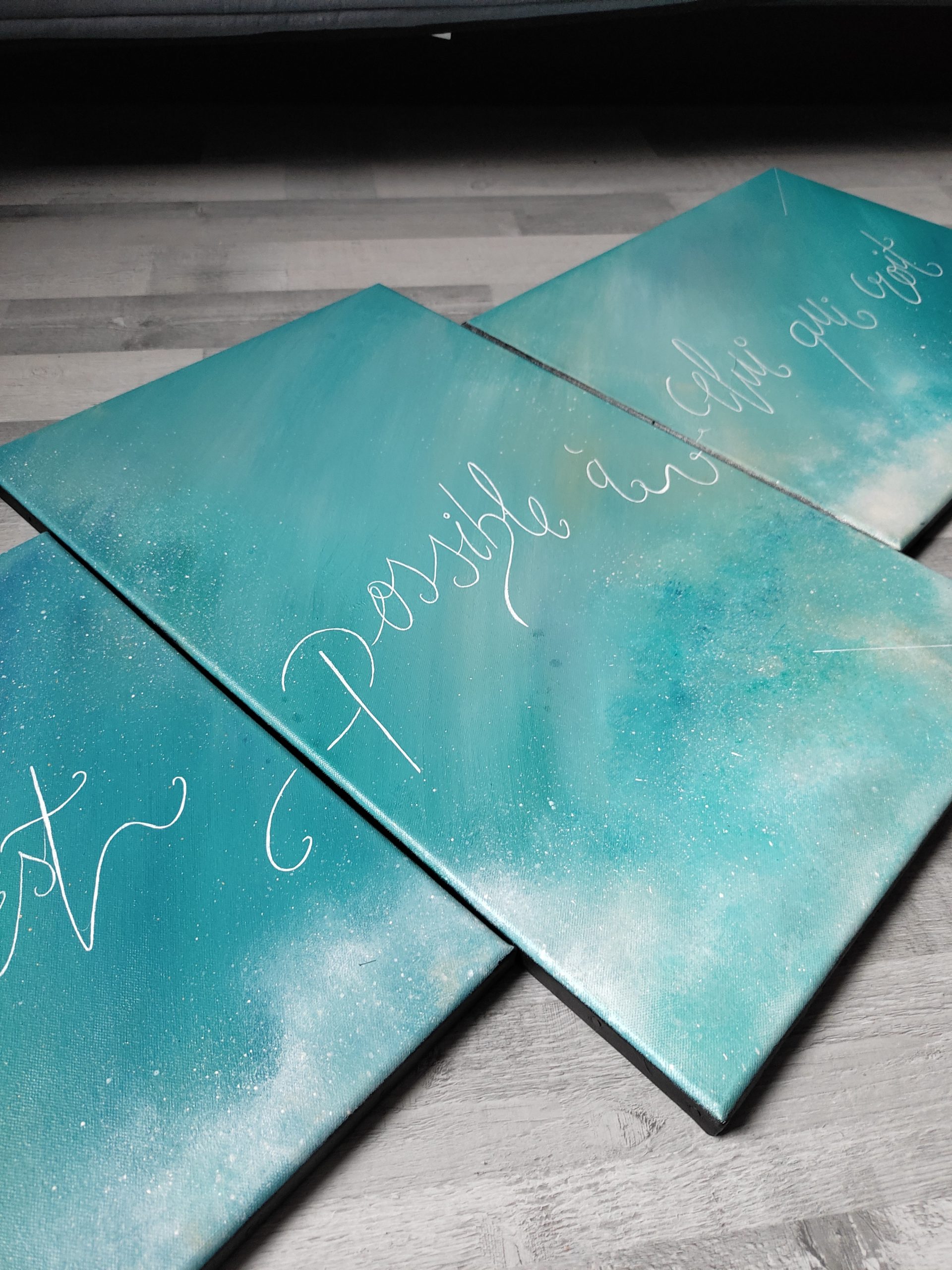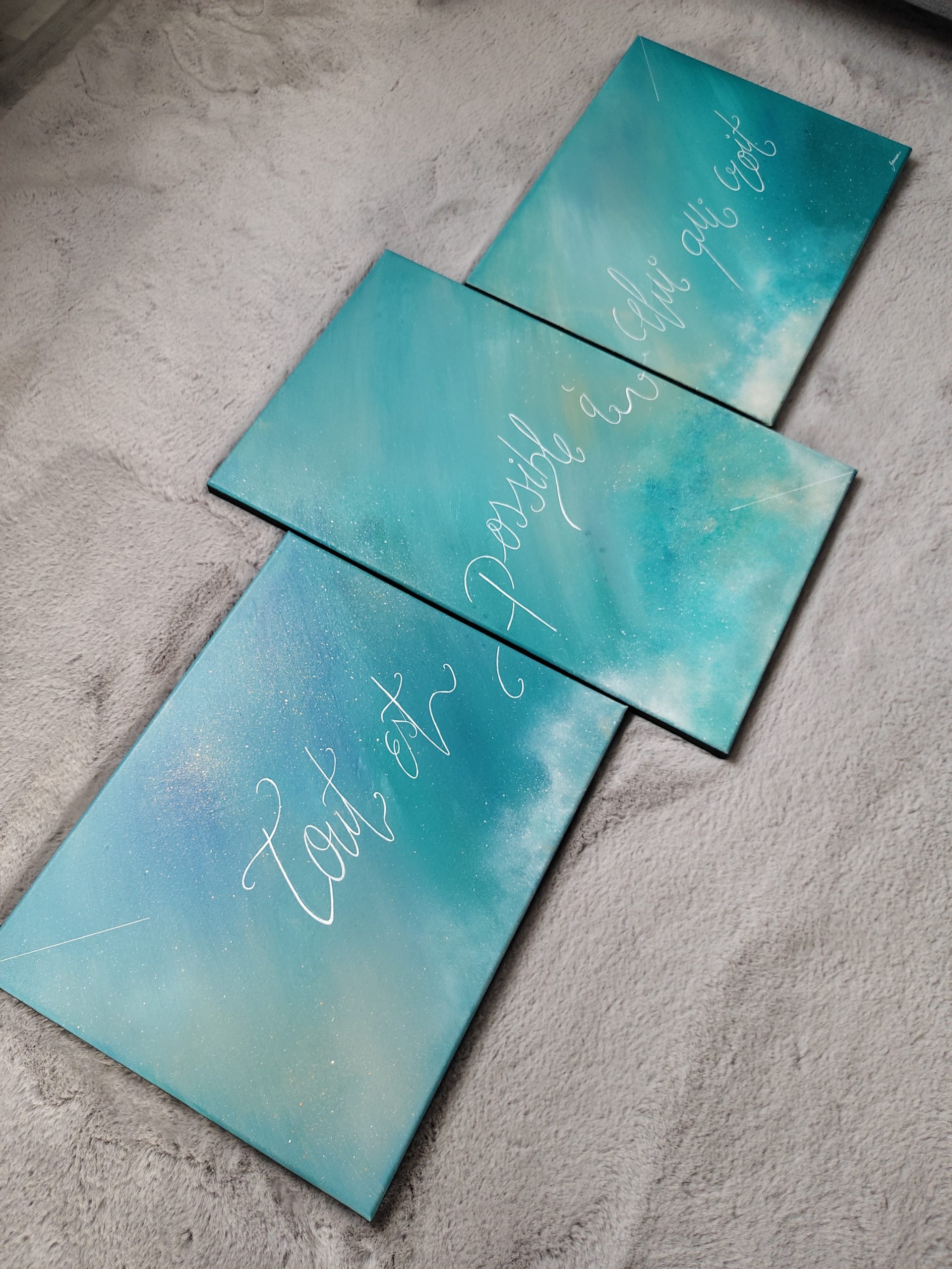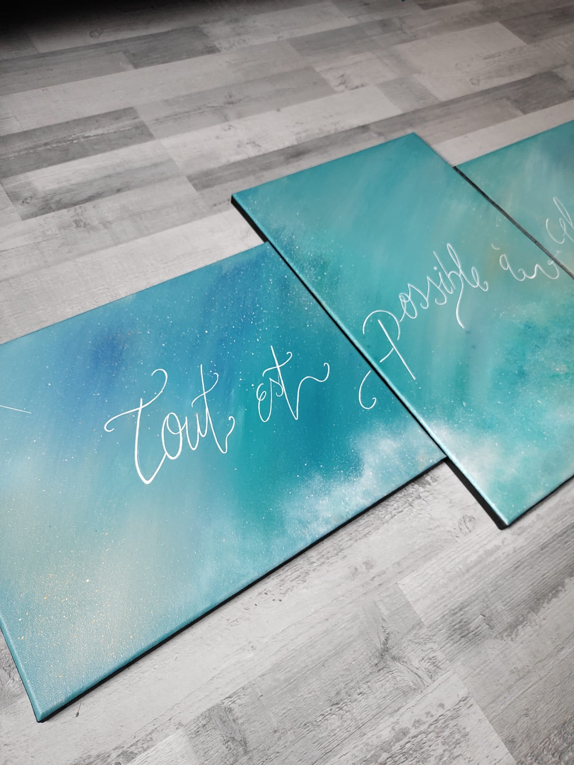Oeuvre unique Toile en coton Peinture utilisée : Acrylique Vernis brillant satiné Signature devant et au dos Dimension, 3 toiles (2* 40/50 + 61/38) soit 138/61
